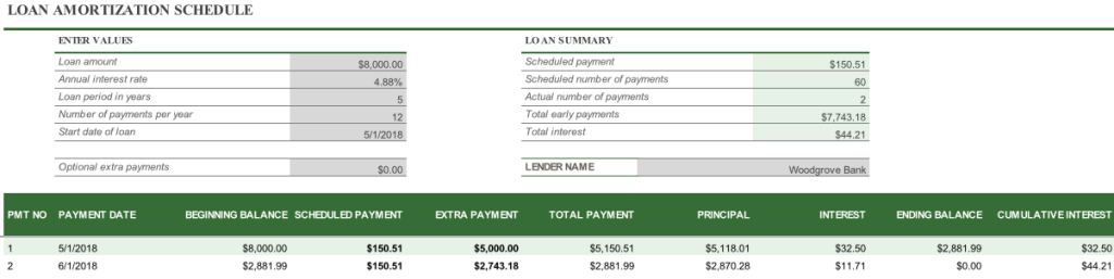 I established a simple amortization schedule through Excel’s templates. We established the loan terms as 5 years (60 months) at 4.875% (same as the mortgage being executed). When I made extra payments to him, I logged them in the spreadsheet. We only made two payments to him, but he made $44 for not having to do anything except accept our money. ๐