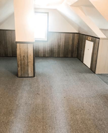 Regardless, we didn’t touch the carpet on the stairs or on the second floor of the house. It’s blue indoor/outdoor carpet. I truly can’t believe we’ve been able to house renters in this place with this carpet still in place. We’ve put it off because re-carpeting stairs is just so expensive relative to doing a whole room. One of the bedrooms on the second floor even has wood paneling, which just made it even more amazing that anybody wanted this house. It was not the most aesthetically pleasing place.