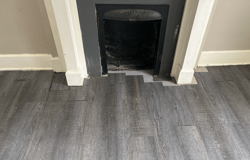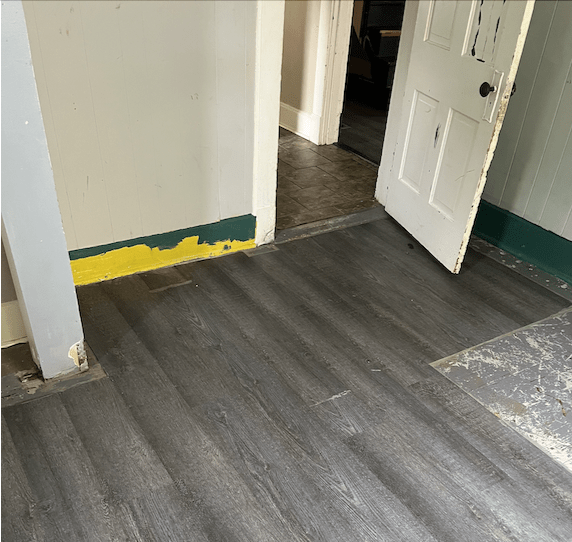 The house has painted floors. The tenant must have been annoyed by the paint being scratched up because of her dogs, so she laid luxury vinyl plank. It was one of the worst jobs I’ve seen. She was really proud of it and was concerned about getting her security deposit back, so she kept pointing out that she laid the floor on her own dime. I kept pointing out she didn’t have approval to do that. It’s one thing to lay the floor that would just be labor to get it up, but instead of moving furniture to lay it, they just used their black caulk to cover the edge. Well, in many places except here, where this was apparently a worthy job.
