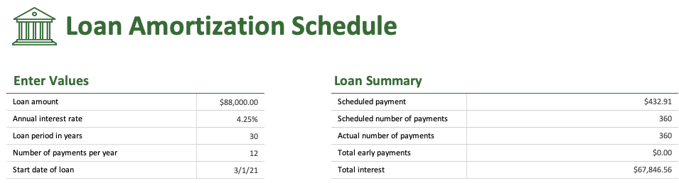 Option 1: 20% down payment equates to a loan amount of $88,000; the annual interest rate is 4.25%; the loan is for 30 years, with 12 payments per year. If we make no additional payments, this totals about $67,800 worth of interest paid over the life of the loan.